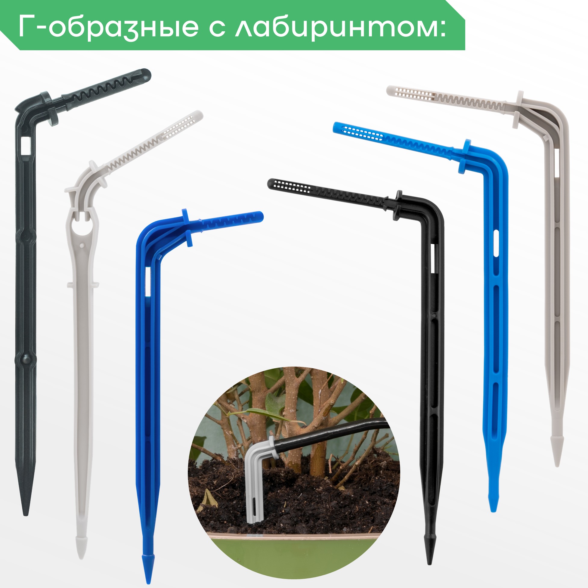 Г-образная капельница - это пластиковый колышек с лабиринтом, дозирующим расход воды.