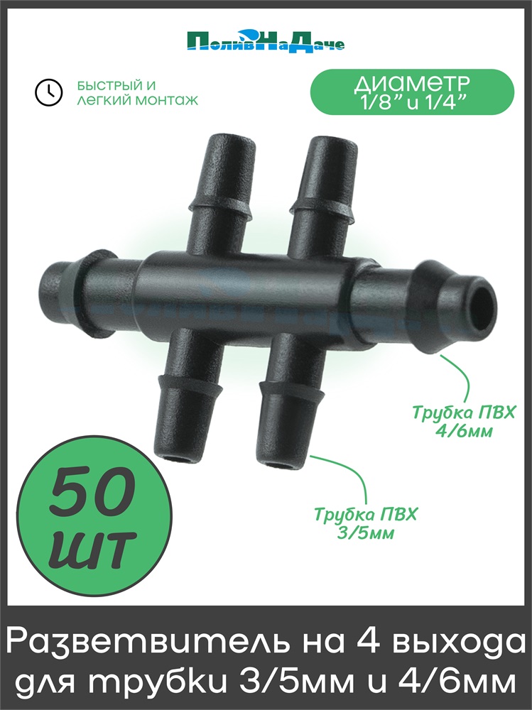 Разветвитель на 4 выхода для микротрубки ПВХ 3/5мм (1/8") и 2 выхода для трубки 4/6 или 4/7мм (1/4").
