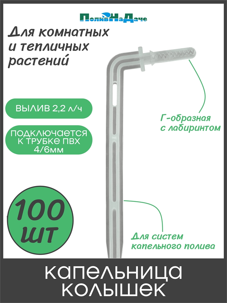 Капельница-колышек с лабиринтом Г-образная 10см (подключается к ПВХ трубке 4/6 или 4/7мм) . Упаковка 100 шт