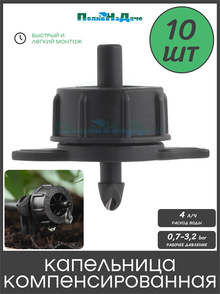 Капельница компенсированная с лабиринтом разборная, 1/4", 0,7-3,2 bar, черная, 4л/ч (TOD0104) - 10 шт