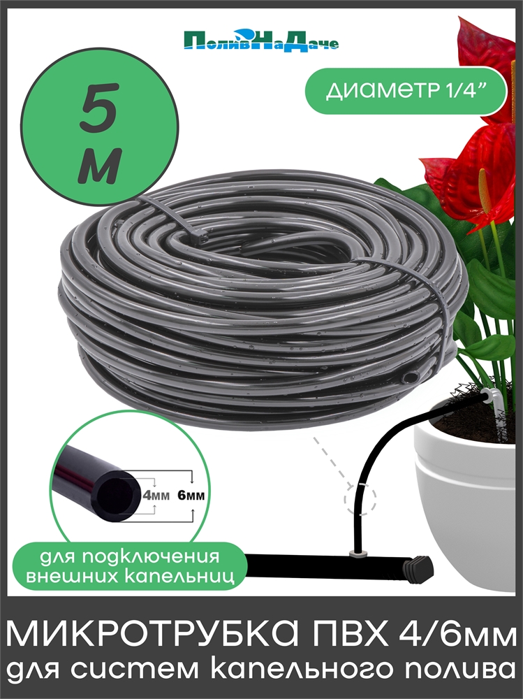 Мягкая трубка ПВХ 4/6 мм (4 bar) широко используется в системах капельного полива, необходима для соединения внешних капельниц с магистральной трубой или шлангом.