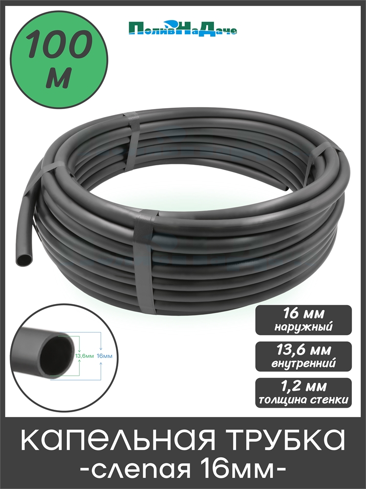 Слепая капельная трубка представляет собой ПВХ трубку диаметром 16 мм (13,6 мм внутренний) с толщиной стенки 1,2 мм.
